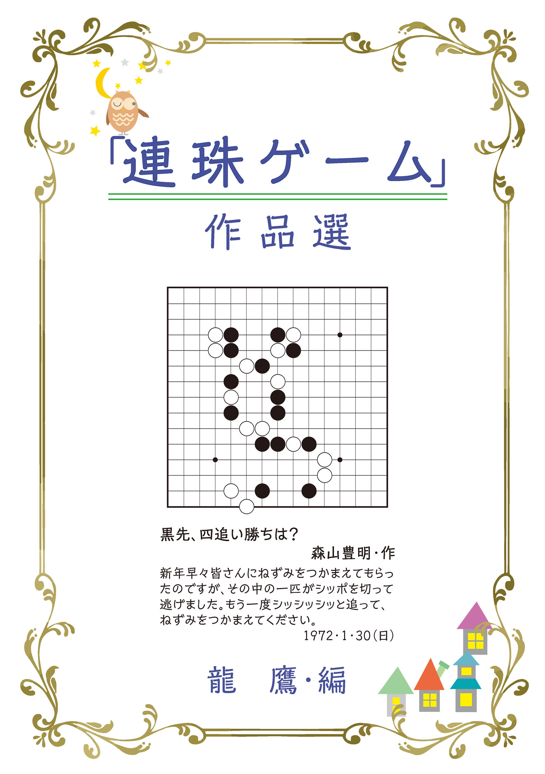 | 「連珠ゲーム」とは 詰連珠界の大御所、森山豊明氏が、1972 年から、2023 年まで、足掛け52年にわたって発行した詰連珠専門のミニコミ紙、 それが「連珠ゲーム」だ。 「連珠ゲーム」作品選 「連珠ゲーム」通算539号にもなる膨大な努力の結晶から、追詰め案196題を選び、纏めたのが本書である。 本編への準備として「詰み珠」「2手勝ち」、途中に息抜き用の「四追い」「4手五連」を24題、表紙と扉に各1題と、 合計222題の作品が収められている。 初心者から上級者まで楽しんでいただけるものと思っている。 A5サイズ、138頁。 2025年12月刊行 頒布価格1,500円、 梱包・送料250円。 購入希望者はメール(GED00036@nifty.ne.jp)で連絡の上、下記へ送金願います。 送金先は下記のいずれかです。 |